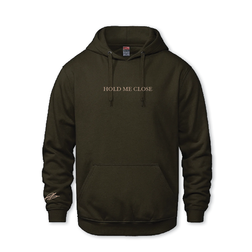 Kangourou (hoodie) brun en coton unisexe, Hold me close brodé sur le devant, une photo de Roxane imprimée au dos et la signature brodée au poignet.