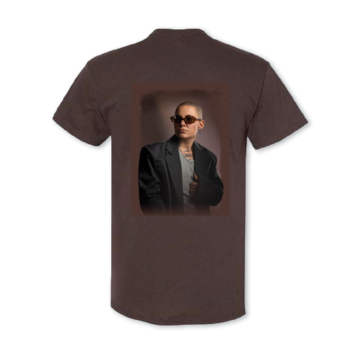 T-Shirt 100% coton supérieur unisexe brun, avec impression au devant Roxane Bruneau et une photo de Roxane au dos.